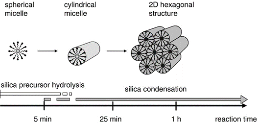 The precipitated material shows Bragg diffraction peaks characteristic of the 2D hexagonal phase. Initially, the cylinders are weakly linked via their coronas. Over the next 1-24 hours, silica species in the spaces between cylinders undergo condensation reactions, resulting in cross-linking and covalent bonding between coronas of cylindrical micelles [5,6,8]: