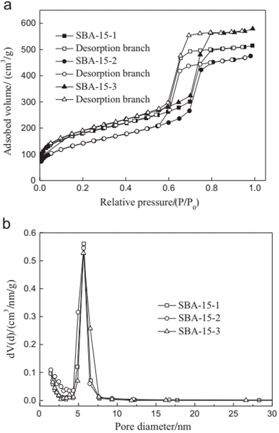 Figure 4 N2 adsorption–desorption isotherms (a) and pore size distribution curves (b) of calcined SBA-15 samples. [12]